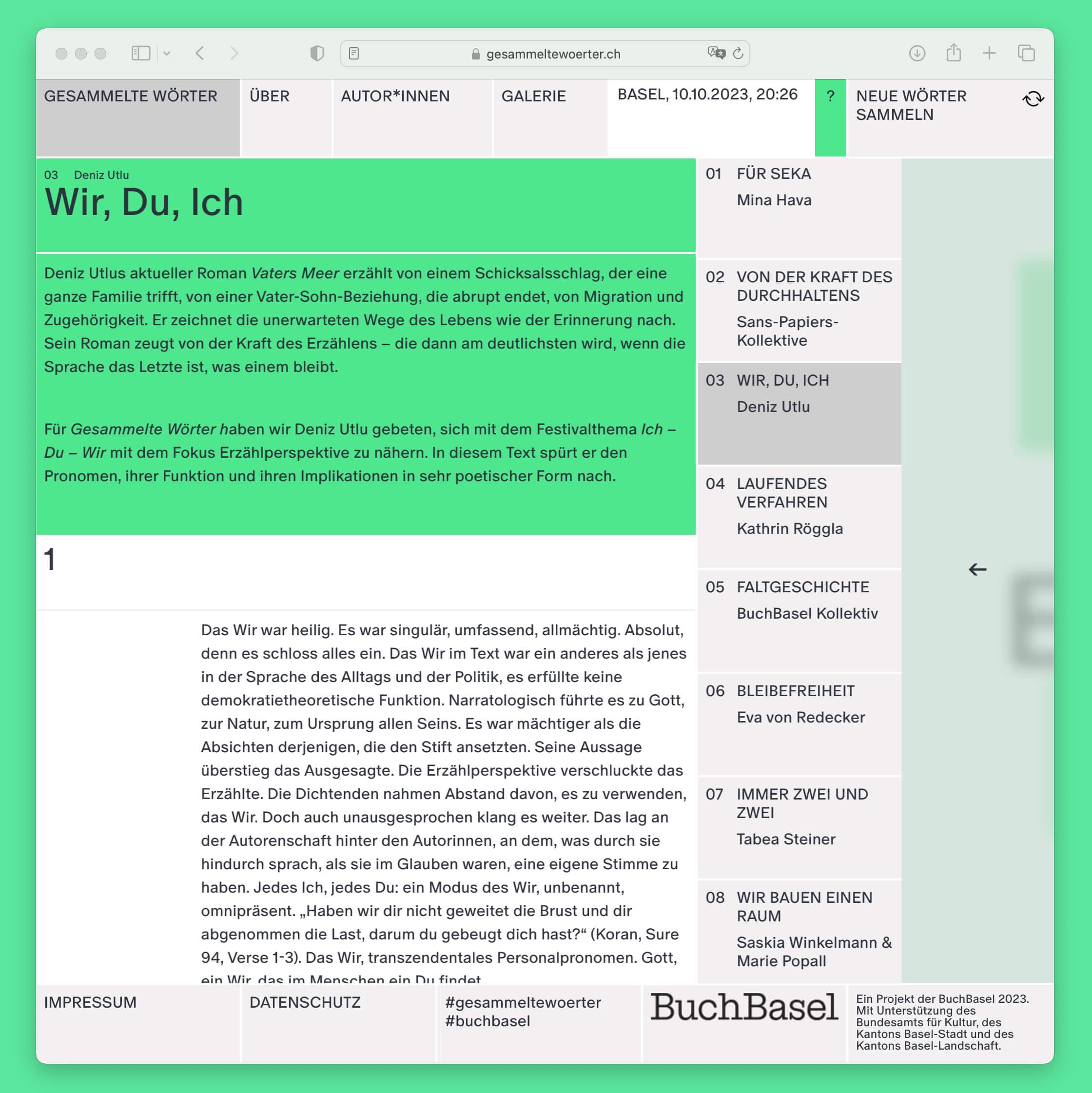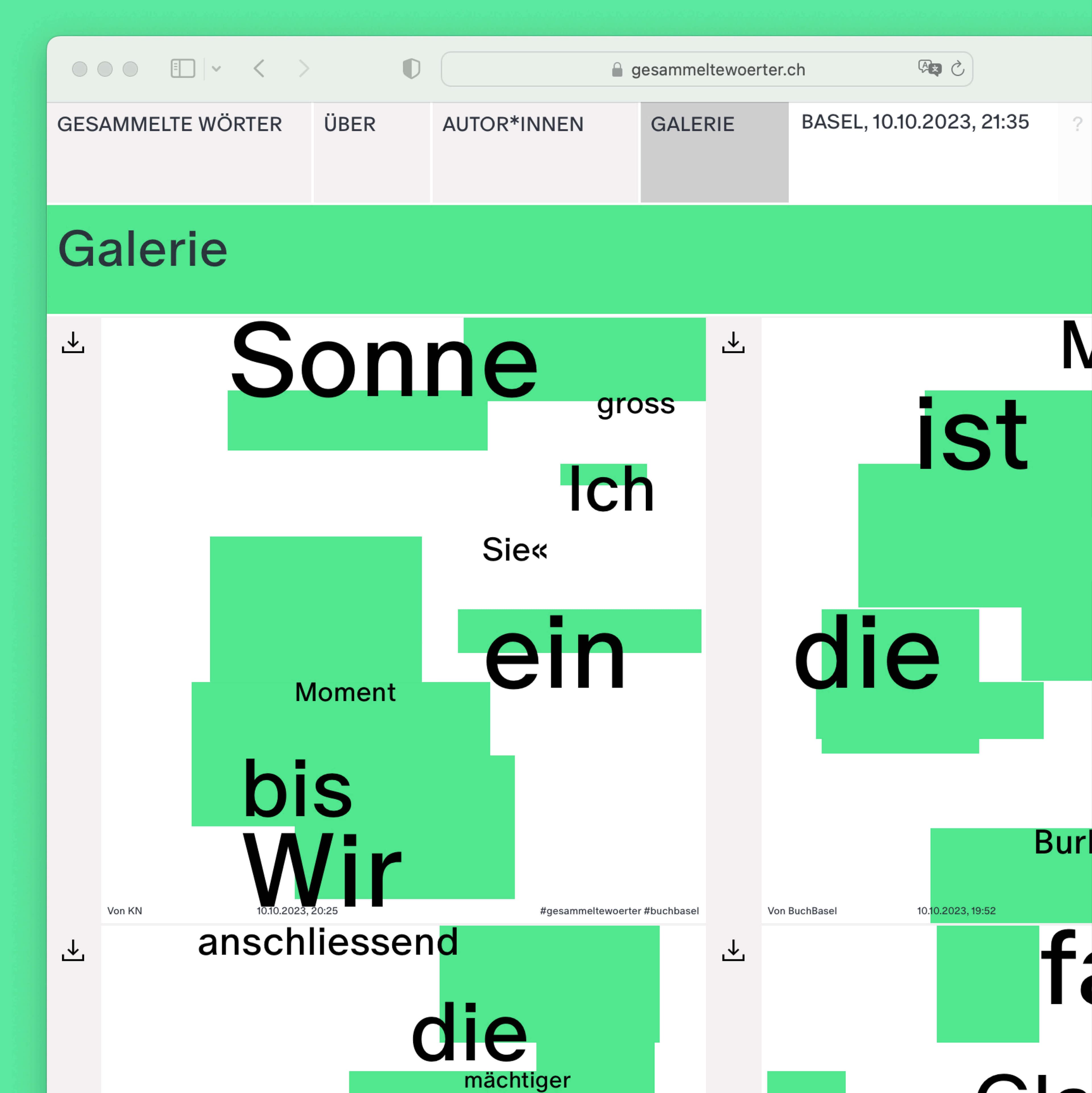 | 2023 | BuchBasel Festival | Installation and online magazine “Gesammelte Wörter” | w/ Lena Hegger and Florian Zia |
