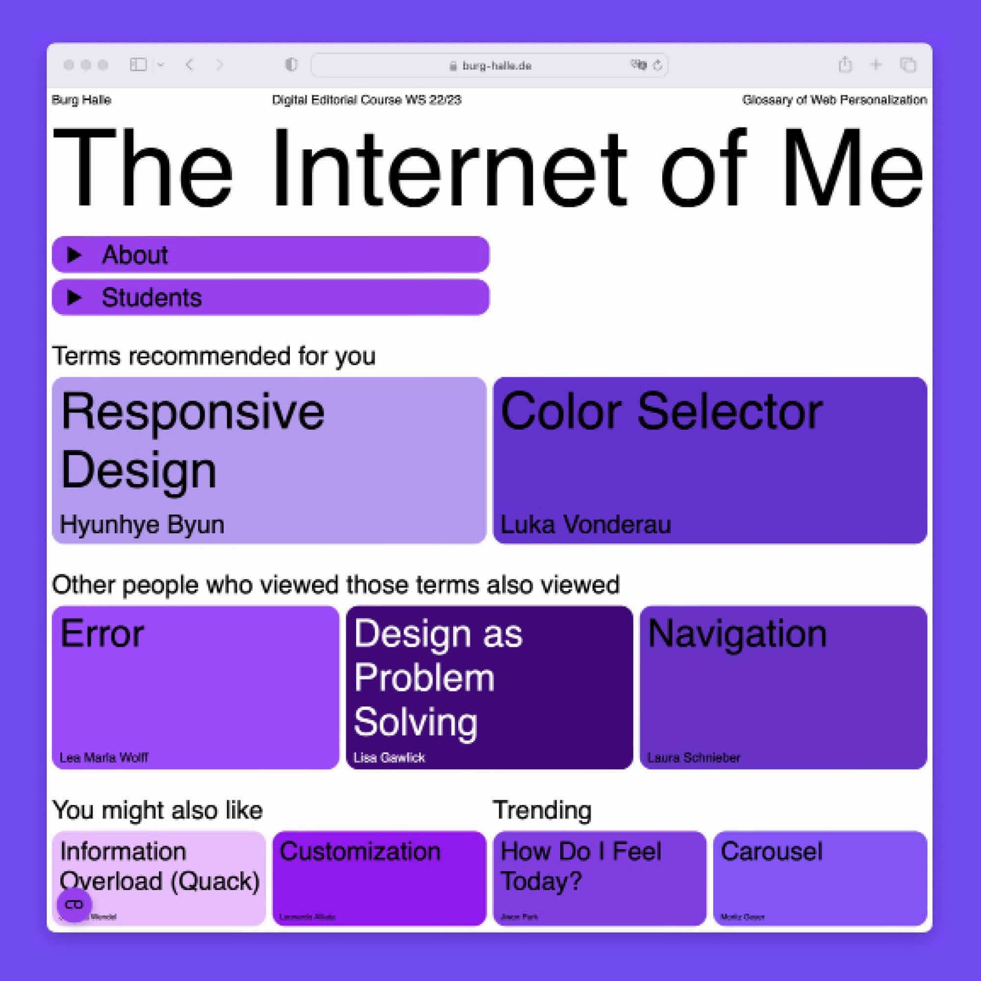 | WS 22/23 | Burg Giebichenstein Halle | Digital Editorial Course | The Internet of Me | Outcome |